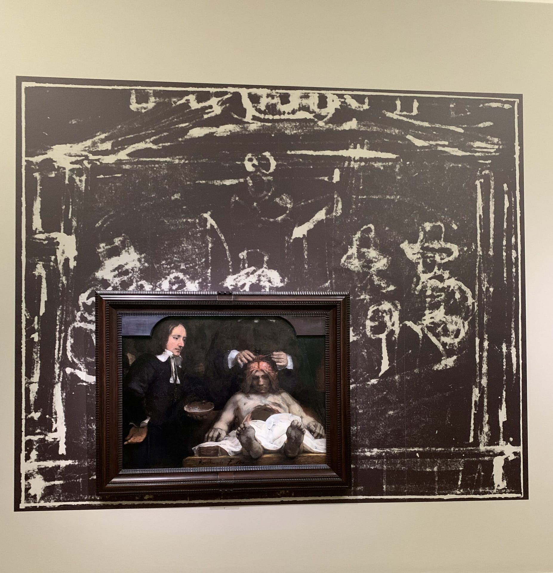 Grandios inszeniert ist das Fragment des Gemäldes der Anatomievorlesung selbst aus demselben Jahr. Die dramatische Verkürzung des Mannes auf dem Seziertisch ist für Rembrandts Stil ebenso ungewöhnlich wie die anatomische Darstellung des geöffneten Gehirns. Die Entwurfszeichnung ist von den Ausstellungsmachern effektvoll dahintergeblendet.