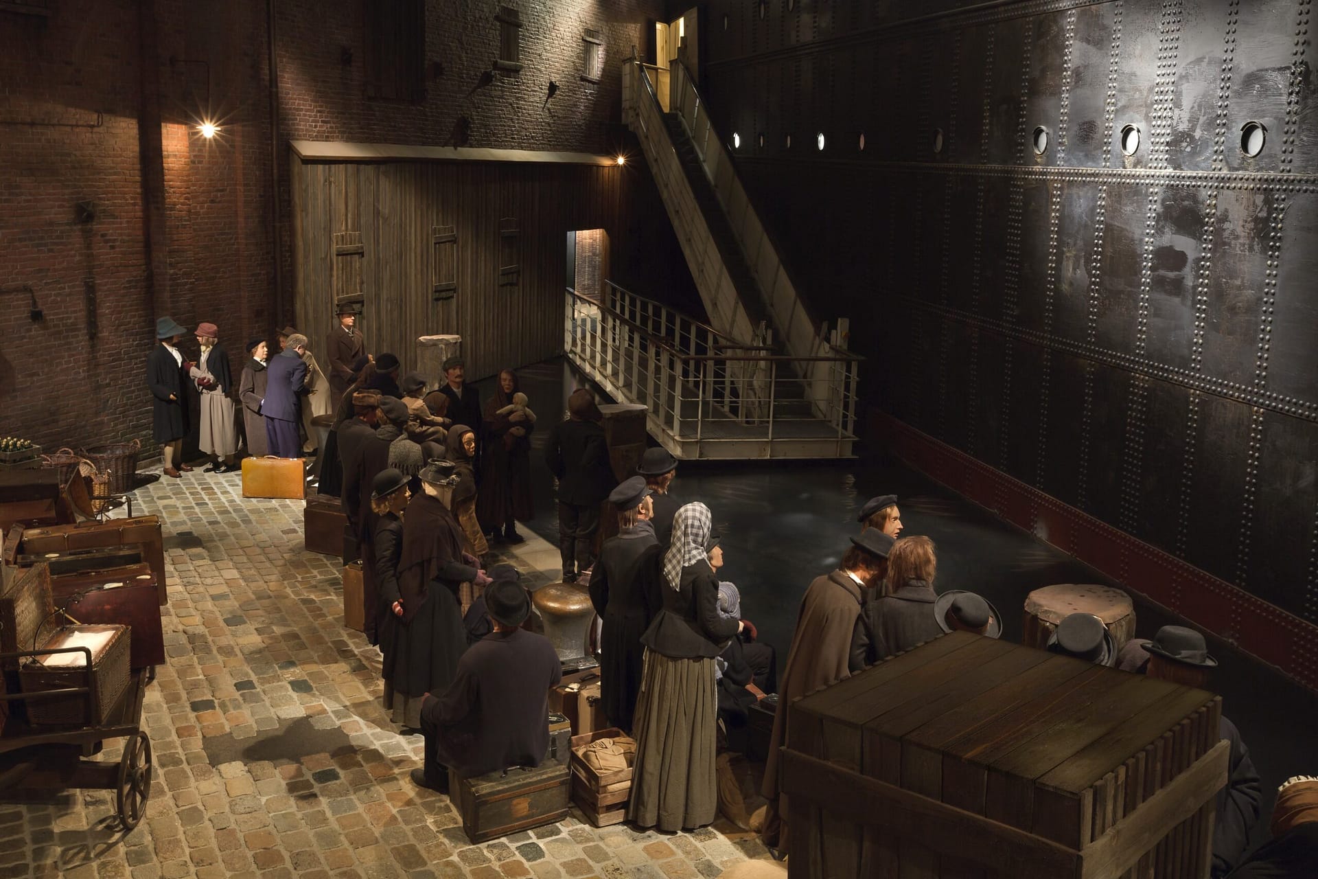 Doch zurück zum Aufbruch. Gleich im ersten Raum findet man sich am rekonstruierten Bremerhavener Hafenkai wieder. Hier drängen sich Reisende, Gepäck stapelt sich, man hört Stimmen, leises Singen. Der Abschied – oft für immer – und die Spannung in der Luft, ist spürbar. Was ging in den Menschen vor, die sich entschieden hatten, die alte Heimat und ihr vergangenes Leben hinter sich zu lassen?