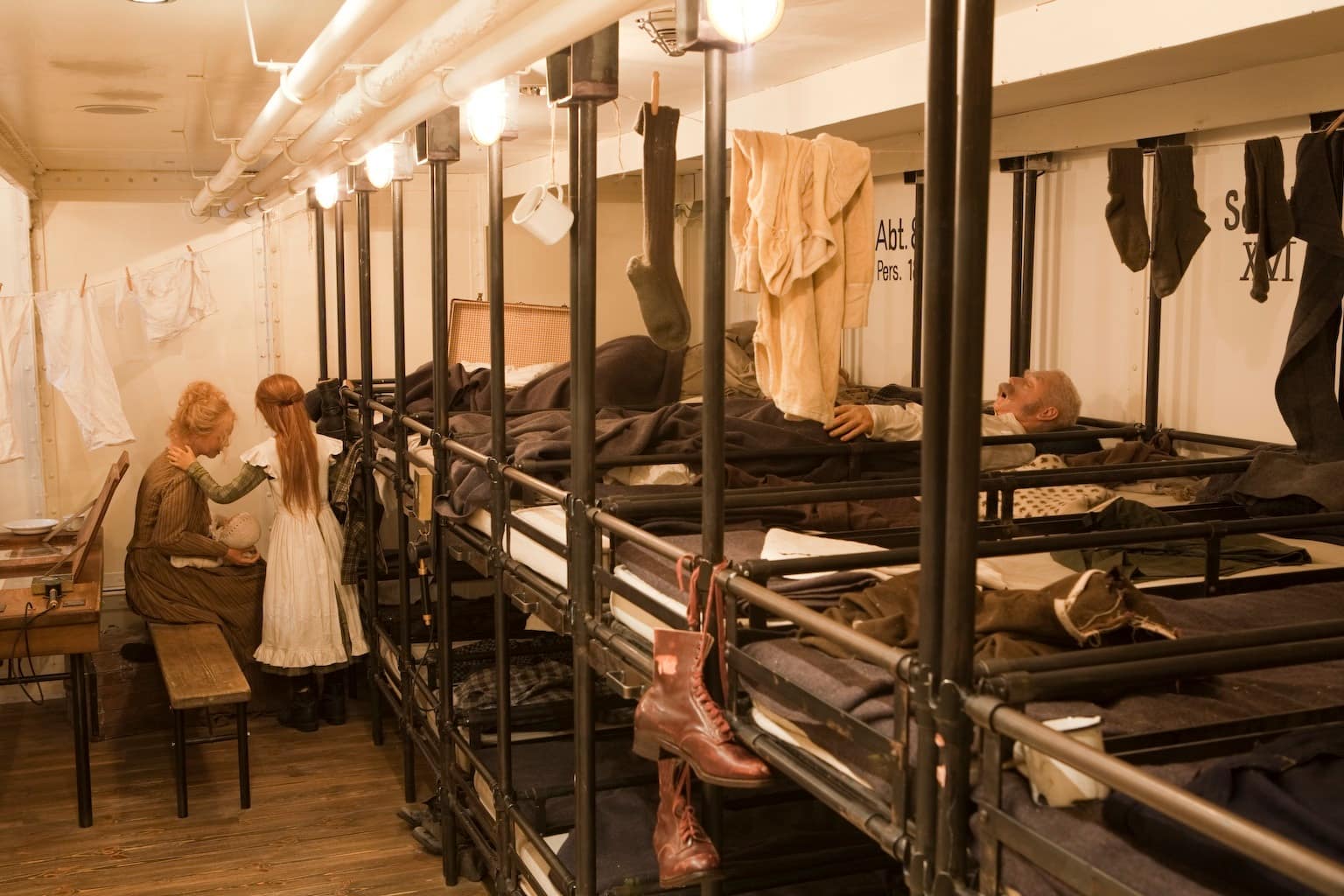 Weiter geht es in die Unterkunft der dritten Klasse. Die Luft ist stickig, die Gänge eng. Man hört Stimmen, Husten und Jammern, liest Briefe und immer wieder laden Hörstationen ein, in die Gedankenwelt der Reisenden einzutauchen. Gedanken, die sie in Tagebüchern und in Briefen an ihre Liebsten festgehalten haben. Die Enge, die Ungewissheit, das monotone Rauschen des Meeres – all das wird spürbar. Und doch liegt auch Hoffnung in der Luft. Die Stimmung der Reisenden hebt sich, je moderner die Schiffe werden. Erinnern die ersten Überfahrten noch an einen Viehtransport der übelsten Sorte, sah das Leben an Bord 100 Jahre später auch für Reisende der dritten Klasse schon sehr viel positiver aus. Gar nicht zu reden von denen, die sich eine Fahrt in der ersten Klasse leisten konnten.