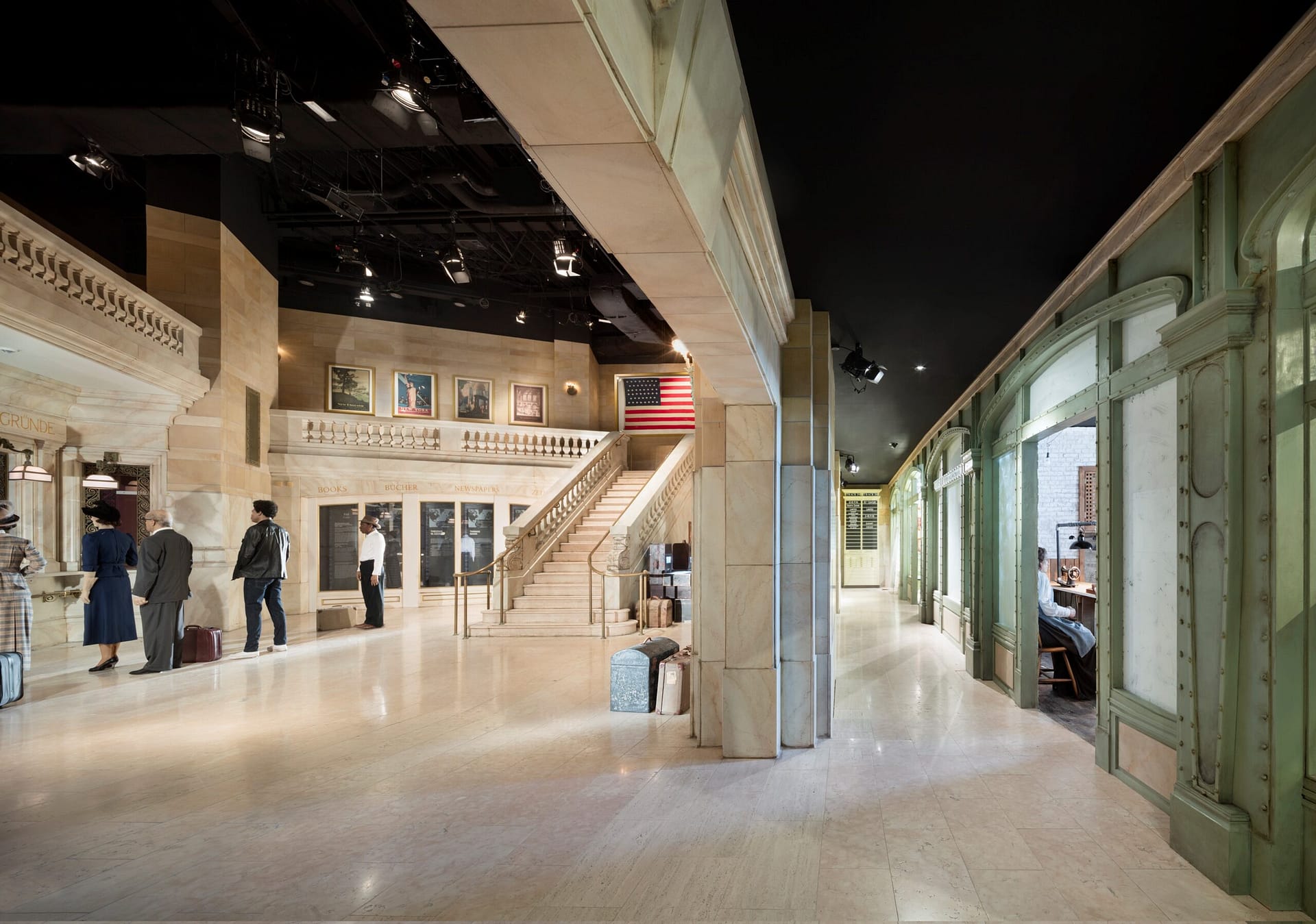 An Hörstationen taucht man ein in die Lebensgeschichten der Auswanderer. Gelesen werden sie von so hochkarätigen Schauspielerinnen und Schauspielern wie Hannelore Hoger, Nina Petri oder Sky DuMont. Doch bevor wir mehr Texte über die Strapazen der Überfahrt hören, gehen wir an Bord. Über eine lange Gangway schreiten wir in den Bauch des Ozeanriesen – unter uns der Kai mit den Wartenden und umgeben vom leisen Plätschern des Hafenwassers. Ein neuer Raum öffnet sich und man spürt sofort: Man ist an Bord. Das Gebäude ist so konstruiert, dass man ein leichtes Schlingern verspürt – eine subtile, aber eindringliche Illusion.