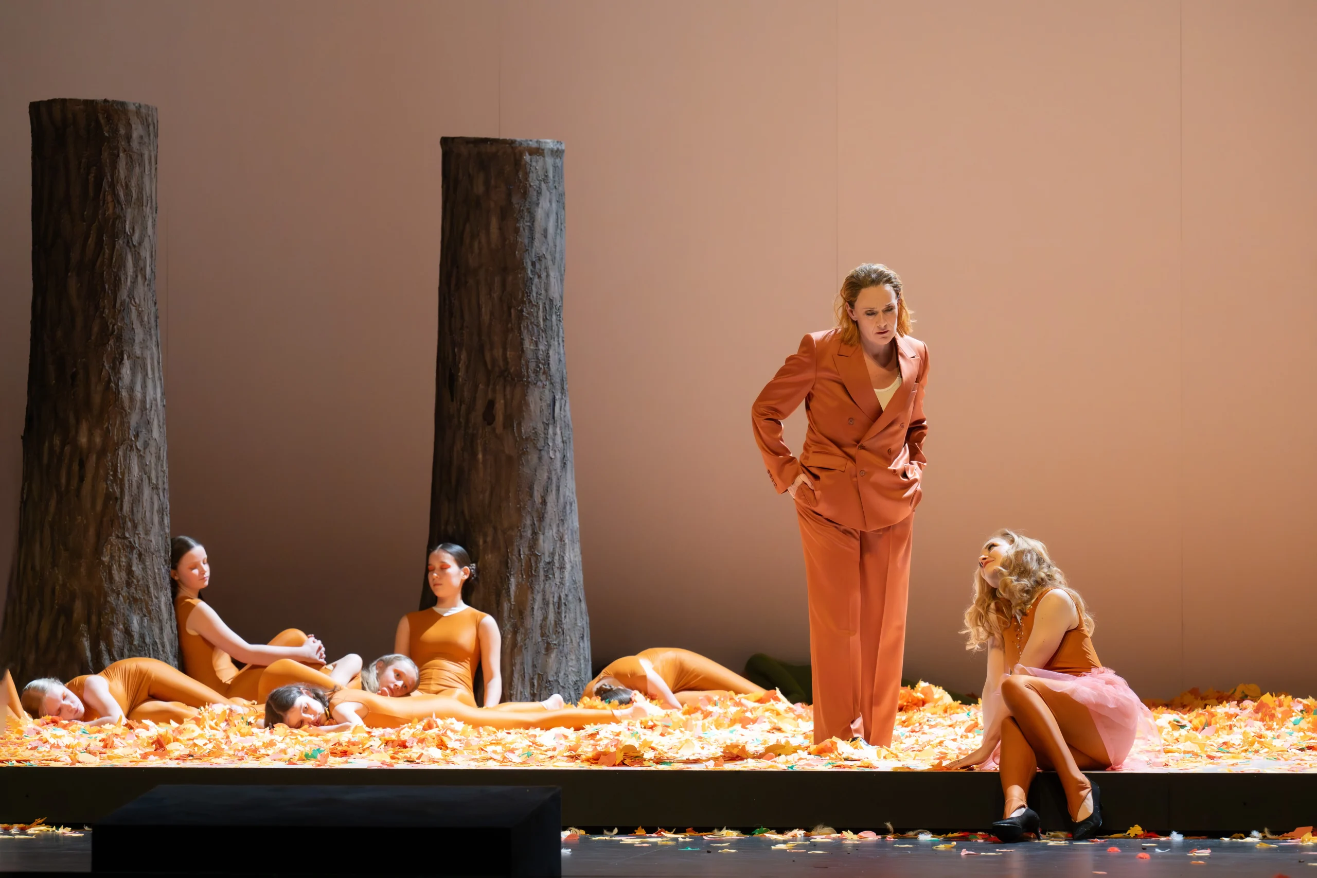 Das geht zu Lasten auch der anderen, mehr als reizvollen Tierschilderungen dieser einzigartigen Musik. Frosch, Dackel, Hühner, Hahn, Eule, Specht, Eichelhäher. Natalia Skrycka modelliert ihren kraftvoll gestaltende Stimme im Sinne modernen Musiktheaters, wenn sie sich als Försterin über die gefangenen Füchsin beklagt. Das erste Zusammentreffen von Mensch und Tier schildert die Oper nicht zufällig als Gefangenschaft. Glanzpaar der Produktion sind Vera-Lotte Boecker als Füchslein Schlaukopf und Magdalena Kožená als Fuchs. In dieser Konfrontation wird die Tragödie des Tieres, das sich in die Menschenwelt verirrt, und das ohne den Menschen besser leben würde, die ganze Oper hindurch anschaulich gemacht.