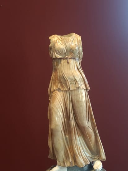 Doch nicht nur die schwere Prominenz beeindruckt. Beim Durchwandeln der Räume fällt der Blick auf eine kleinere, zarte Statue aus Alabaster. Es ist vermutlich Athena. Allein die natürliche Marmorierung des glänzenden Materials verzaubert und stiehlt den großen Göttern fast die Schau. Kopf und Arme fehlen und doch scheint die zarte Gestalt anmutig zu raschem Schritt anzusetzen, die Beine umspielt vom transparenten Gewand. Hier braucht es keine Farbe, nicht einmal ein Antlitz, um der Fantasie freien Lauf zu lassen