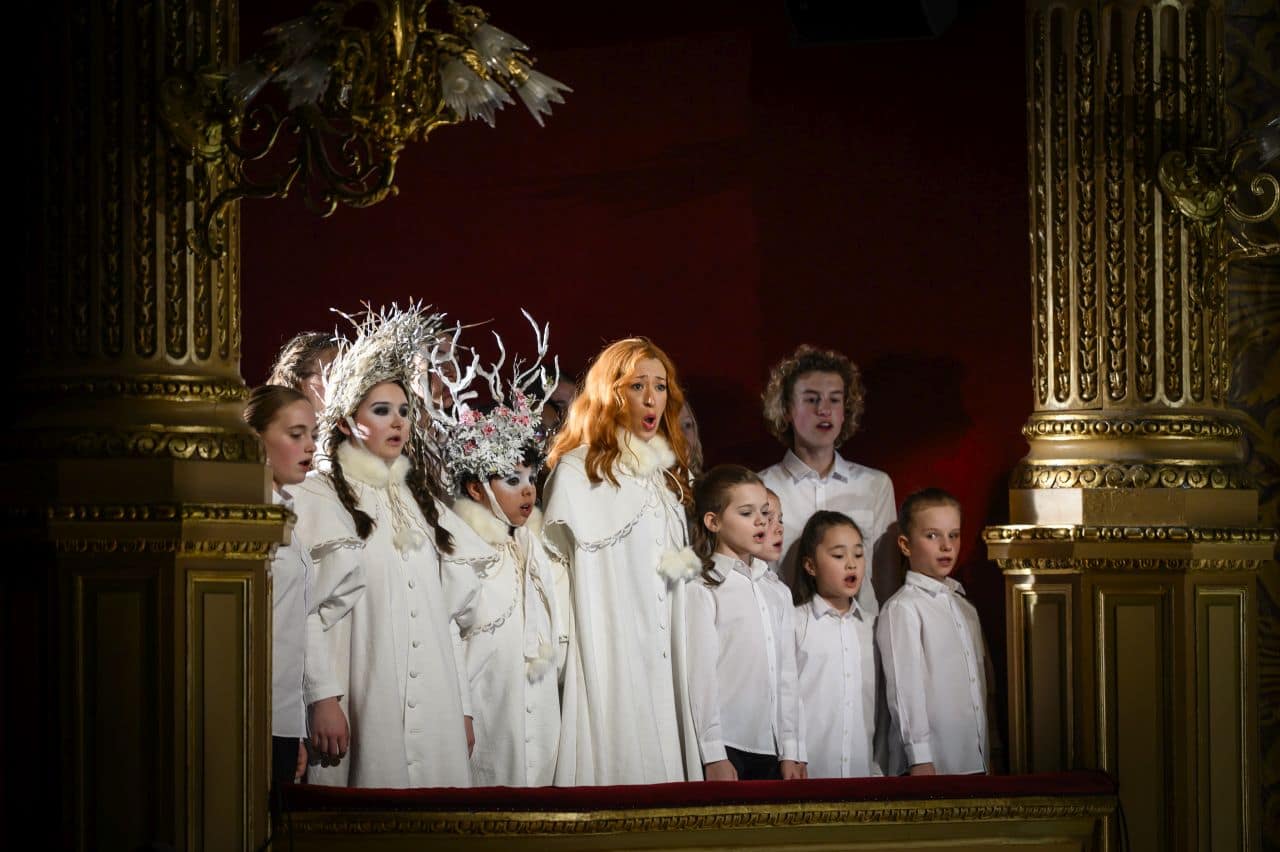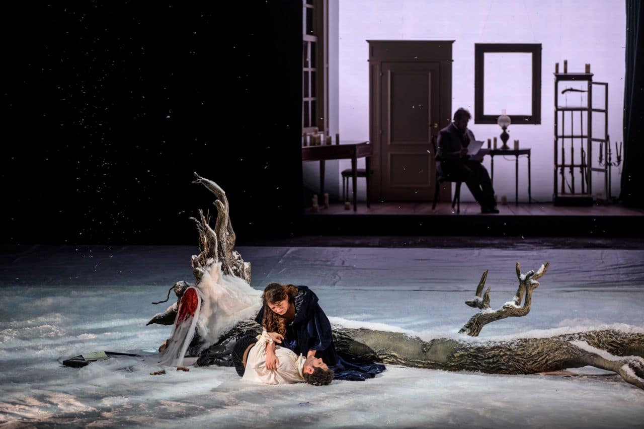 In this new production at Opéra Royal de Wallonie-Liège, the direction evokes Goethe’s era. Marie Hélène Balau’s elegant, historically inspired costumes hint at a period film. At times, they feel overly ornate, but not natural. The setting opens in front of Charlotte’s modest house, with bare trees that later bear lanterns in autumn, transforming by the opera’s end into snow-covered wooden skeletons. In the final act, the dying Werther is enveloped by icy air and Charlotte’s warm embrace.