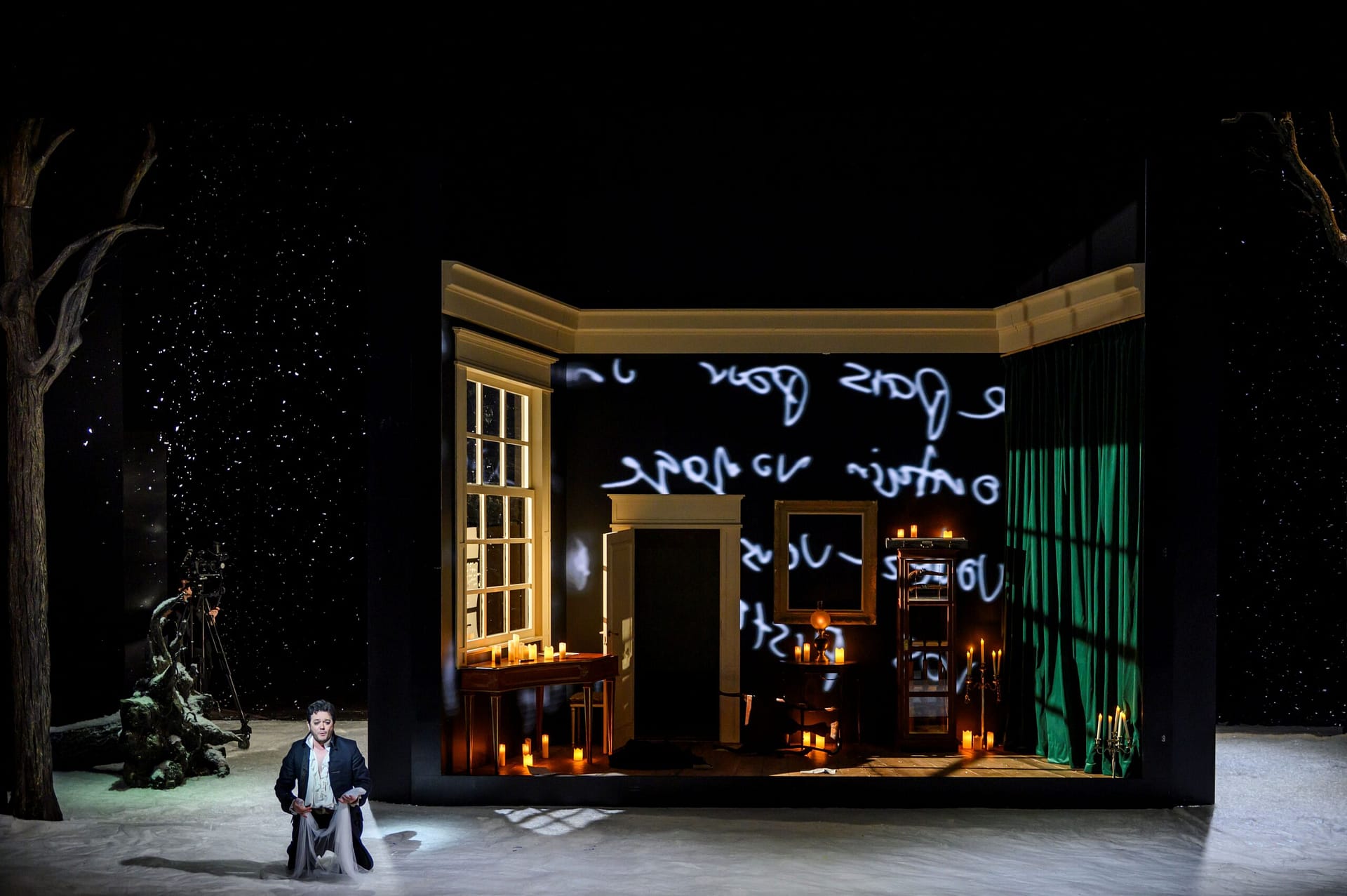 In der Neuinszenierung des Opernklassikers „Werther“ an der Opéra Royal de Wallonie-Liège setzt das Team des Regisseurs auf die Rückbesinnung ins Goethe-Zeitalter. Die eleganten, sehr an einen historischen Film erinnernden Kostüme von Marie Hélène Balau verweisen darauf. Manches wirkt schön, aber zu sehr ausstaffiert denn natürlich. Die Szenerie spielt zuerst auf dem Vorplatz vor dem Häuschen von Charlotte. Kahle Bäume, welche später im Herbst mit Lampions behängt werden, wandeln sich am Ende der Oper in zwei sterbende, vom Schnee bedeckte Holzgerippe. Hier umhüllt im letzten Akt den sterbenden Werther die eisige Luft und die warmen Arme Charlottes. Bühnenbauer Rudy Sabounghi kreiert für Charlotte eine schmale Kammer mit Klavier und Schreibpult. Ein die Couleur wechselndes Bild an der Wand entspricht den inneren Zwängen, Beklemmungen und Nöten des Herzens Charlottes.