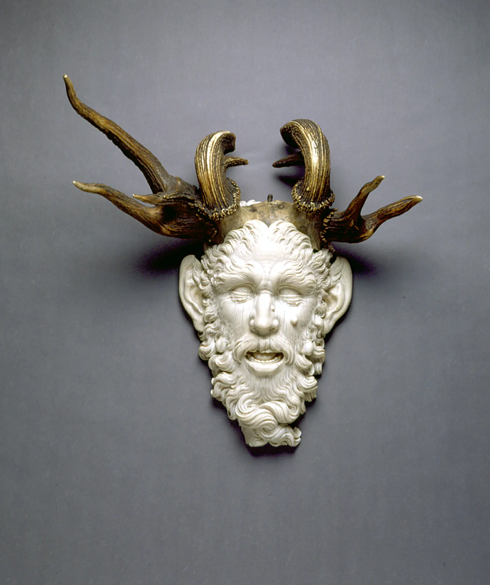 Christof Angermair (1580-1633): Satyrkopf mit Hirschgeweih, 1624-27 aus Elfenbein, Hirschgeweih, Stahl und Holz, Leihgabe aus dem Bayerischen Nationalmuseum, München,