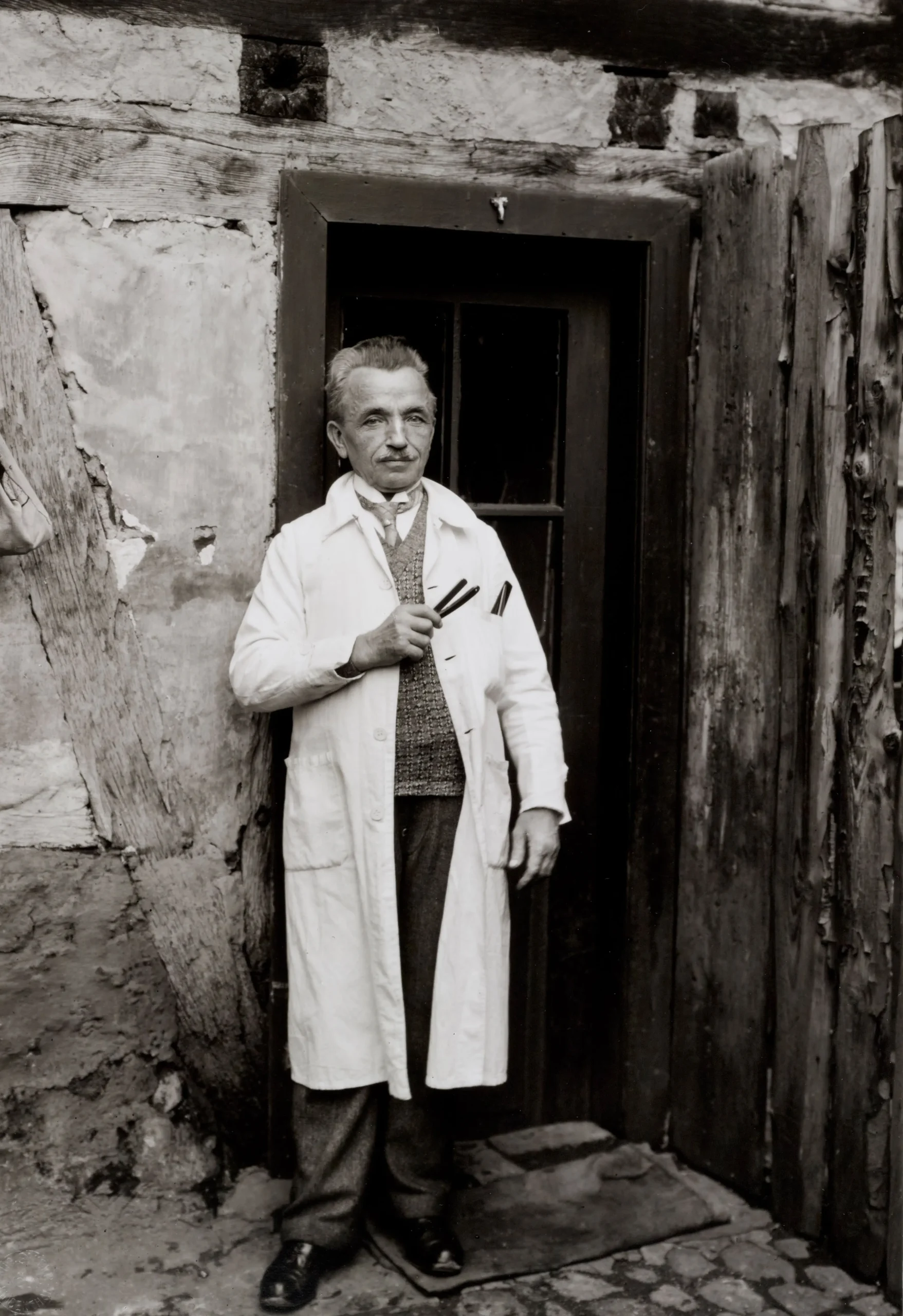 Eine von ca. 600 Fotografien verschiedener Gesellschaftsschichten und Berufsgruppen August Sanders zeigt einen Frisör, der sich im Jahr 1930 stolz und tadellos mit Krawatte und in weißem Kittel gekleidet vor einem zerfallenen Hauseingang präsentiert.