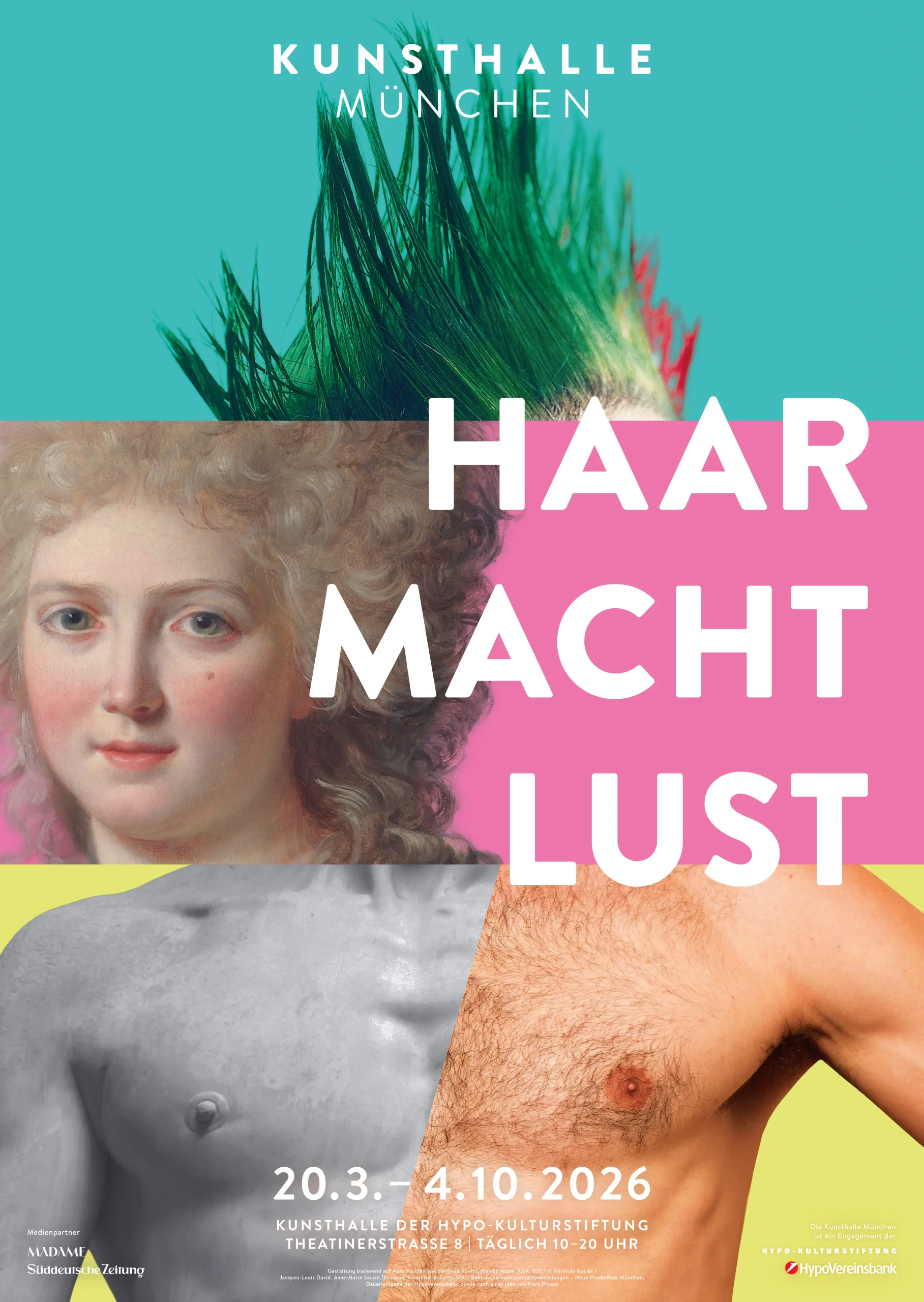 Gestaltung basierend auf Ausschnitten von Herlinde Koelbl, Projekt Haare, Punk, 2007 © Herlinde Koelbl /Jacques-Louis David, Anne-Marie-Louise Thélusson, Comtesse de Sorcy, 1790, Bayerische Staatsgemäldesammlungen – Neue Pinakothek München, Dauerleihgabe der HypoVereinsbank, sowie nach einer Idee von Naro Pinosa