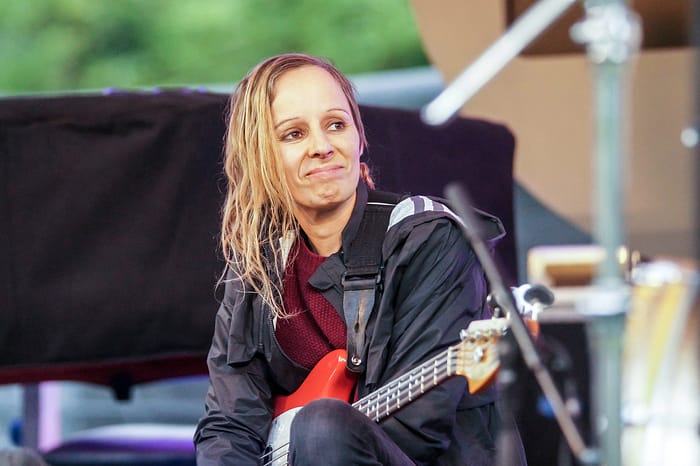 Die englische Band „Skylla“ um die Südtiroler Bassistin Ruth Goller musste wortwörtlich improvisieren, als sie nach wildem Reisechaos auf ihrem Flug von London nach NRW erst kurz vorm Auftritt in Moers eintraf, aber dann doch auf Anhieb in ihre rätselhafte Poesie aus sphärischen Tonfolgen auf dem E-Bass und repetierten mehrstimmigen Vokalisen hineinfand. Seit Schlagzeuger Max Andrzejewski bei Syklla dabei ist, entwickelt sich das Format in neue Richtungen – man wünscht sich irgendwie, auch mal eine Duobesetzung zwischen Ruth Goller und Max Andrzejewski zu erleben.