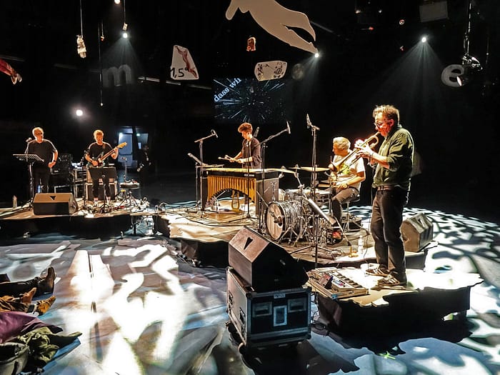 Hanns-Dieter Hüsch wäre in diesem Jahr 99 Jahre alt geworden, aber die Texte des gebürtigen Moersers könnten gerade erst den vielen menschlichen Befindlichkeiten von heute auf den Leib geschrieben sein. Deswegen war es eine großartige Idee, diesen, in Moers geborenen Autor und sein gewichtiges literarisches Erbe zum Narrativ und roten Faden im Programm zu wählen und gleich mehrere anspruchsvolle Produktionen daraus zu generieren – etwa das Projekt „Henn, Türk und Toxodon haben jetzt zugegeben“. Johann Henns tiefschürfende Lesung verlieh diesen Texten eine ganz neue Sprengkraft. Vor allem aber wurden die Worte des Moerser Autoren auf vielsagende, assoziative Umlaufbahnen geschickt durch eine fantastische Besetzung mit Markus Türk (Trompete) sowie Raissa Mehner (E-Gitarre), Salome Amend (Vibrafon) und Simon Camatta, die zusammen das Trio Toxodon bilden und denen zu Hüschs sarkastischer und empathischer Weisheit ausgiebig pulsierende Klangszenarien einfielen.