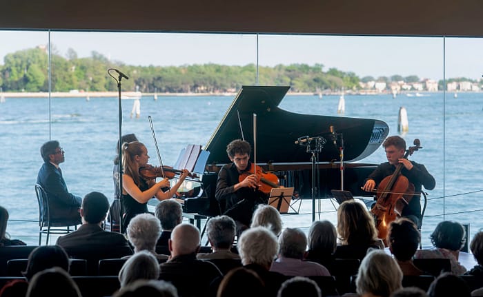 Abseits der diesjährigen Biennale Ereignisse fand ein Kammermusikkonzert mit Klavierquartetten von Gabriel Fauré und seines Schülers George Enescu statt. Es verweist auf die exemplarisch hohe künstlerisch-musikalische Qualität aller Bru Zane Veranstaltungen. „Fauré et ses élèves“ lautet das Motto der Kammermusikreihe der diesjährigen Frühlingskonzerte, die in Kooperation mit Asolo Musica stattfinden und die sich allesamt um besondere, erlesene Kompositionen der Meisterschüler Faurés drehen. Die kleine Insel San Giorgio, auf der der Klavierquartett-Nachmittag „Primi Quartetti“ stattfindet, nimmt atmosphärisch gefangen. Für eines der Highlights des Palazetto Bru Zane haben sich drei junge Künstler zusammengefunden, die in der Chapelle Musicale Reine Elisabeth, Brüssel in Residenz, studieren und am Anfang ihrer musikalischen Laufbahn stehen: die Geigerin Hawijch Elders, der Bratschist Natanael Ferreira und der Cellist Aleksey Shadrin. Mit dem international renommierten Pianisten, Kammermusiker und Pädagogen Frank Braley formierte sich ein hervorragend agierendes, harmonisierendes Ensemble, das tief in die Klavierquartett-Welt Faurés und Enescus eintauchte.